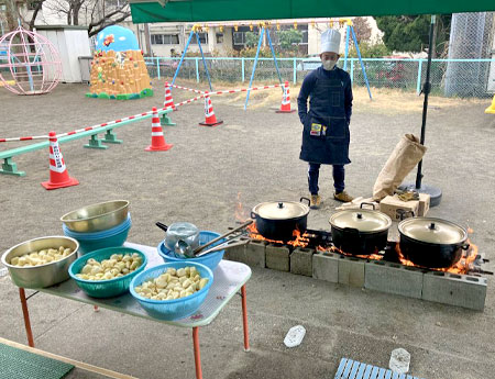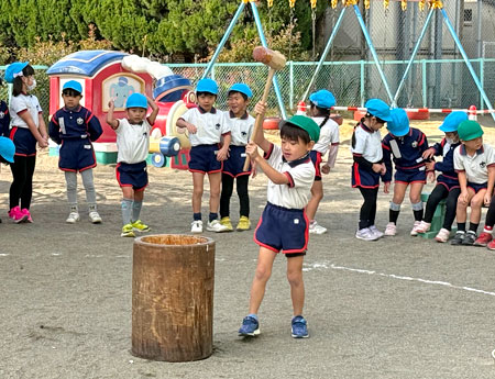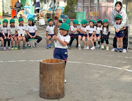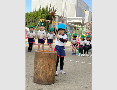 | 「よいしょ〜!!」という掛け声で年長さんがおもちつきを体験しました。 その日の給食ではつきたてのお餅を試食しました。 |