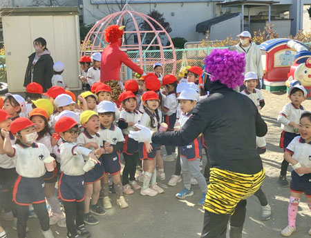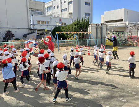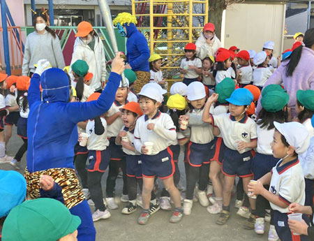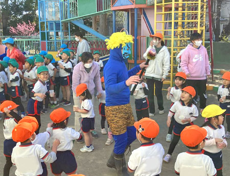 | 今日は園庭で豆まきをしました。 体の大きなコワイ鬼が登場すると、子どもたちはワーワーキャーキャー言いながら 一生懸命に豆をまきました。最後に鬼が退散して楽しく終えることができました。 |