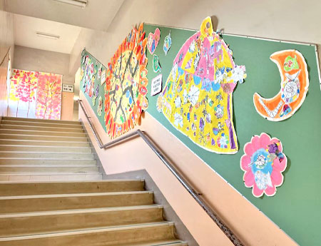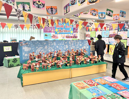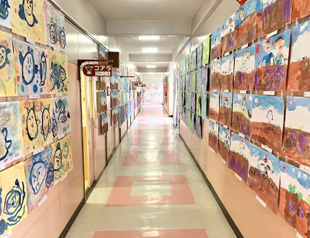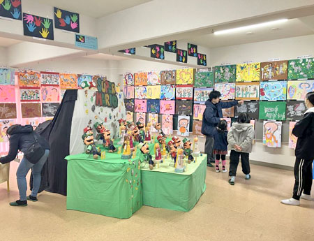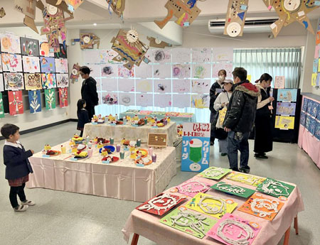 | 今年1年で頑張った作品をおうちの人に見てもらいました。 各クラステーマに沿って部屋の飾りつけをしました。 ホールではポップコーンやゲームコーナーを設け、大変賑わっていましたね! 作品展明けの登園日には他クラスの作品をみんなで見てまわりました。 |