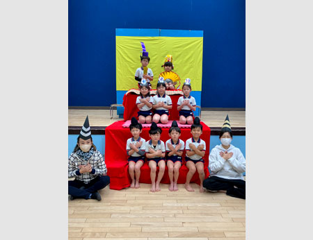 | リトミックの授業でひな祭りゲームをしました。 お内裏様やおひな様になって、すまし顔です。 |