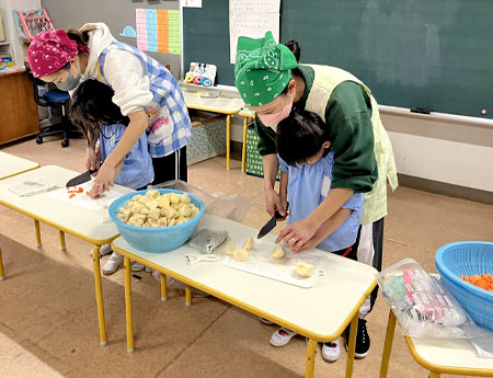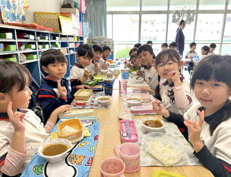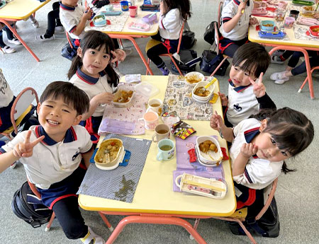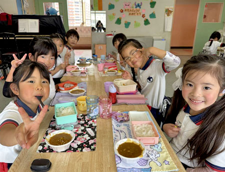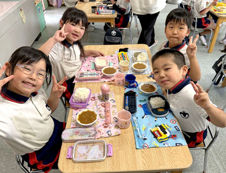 | 年長さんが切った野菜で作ったカレー。 年長さんと年中さんは、一緒にカレーを食べながらおしゃべりも楽しんでしましたね! |
